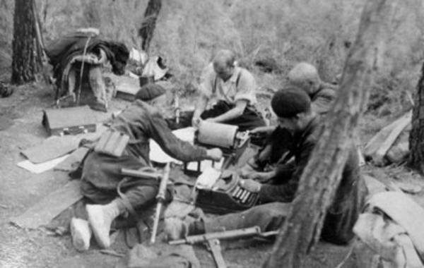 Campamento de Aguaviva, en la sierra de Teruel. Confección de propaganda guerrillera.